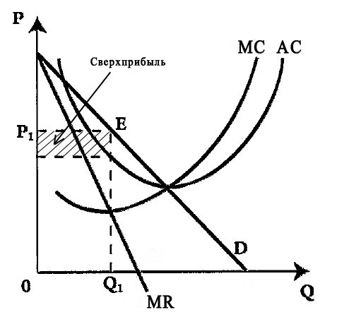 В коротком периоде в условиях монополистической конкуренции фирма, максимизирующая прибыль, будет стремиться осуществлять производство при такой комбинации цены (ОР1) и объема выпуска (OQ1), которая уравнивает предельные издержки (МС) и предельный доход (MR), т.е. МС = MR. В этом случае фирма может извлечь сверхприбыль.
