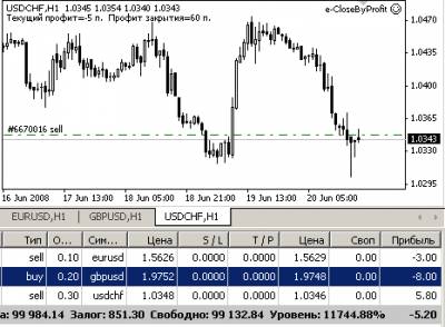 - TakeProfit=60 - Уровень общей прибыли в пунктах по счёту.